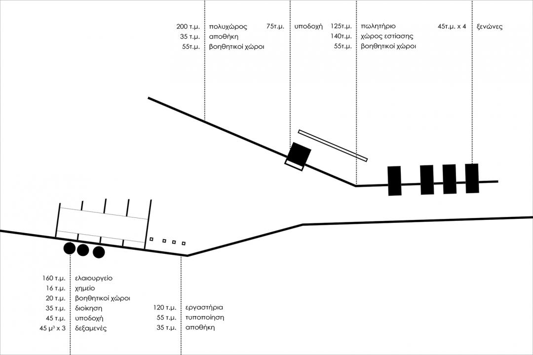 Our proposal includes an oil-press factory, bottling facilities and workspace of oil by-products and other traditional products. In fact, these would substitute the existing facilities of the cooperative operating in Sotirianika. In addition, the proposal would include a multi-purpose space addressed to educational programs, workshops and local events, a giftshop, a café and guest houses accommodating visitors of the building complex as well as professional partners of the cooperative. The proposal aims to the reinforcement of locality and to create incentives. Employment incentives for the residents to return to the settlement and visiting incentives for the public, to the complete regeneration and revival of the settlement within the settlement complex network mentioned above. Therefore, productive and cultural interest would be the cornerstone of the revival of the village. The slope northeast to the village was selected as the intervention area, whose main characteristics are the unplastered stonewalls that create horizontal fields for cultivation and also the dense planting of olive trees and walnut trees.